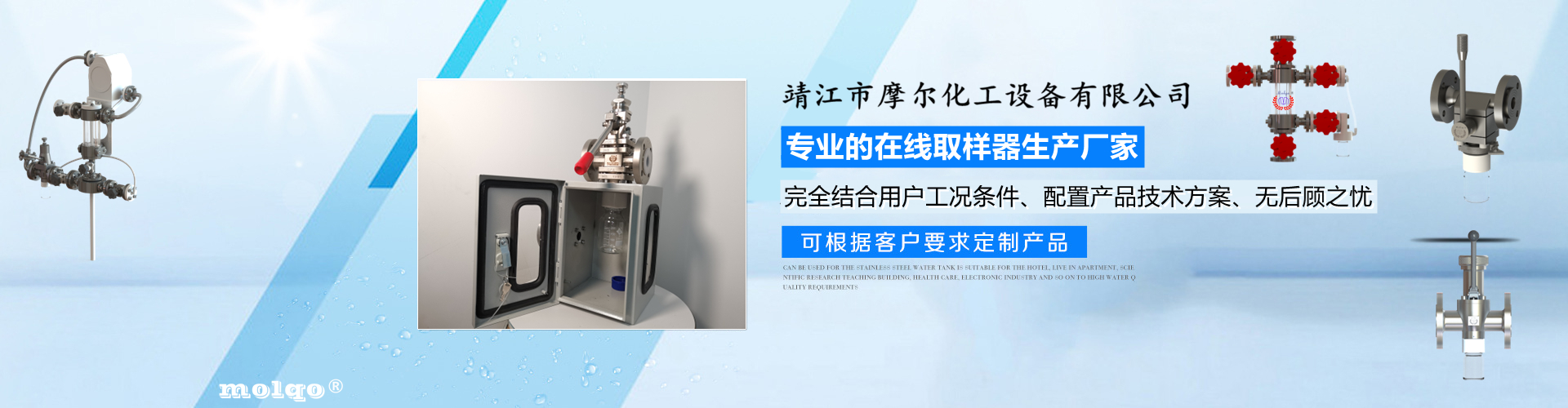 靖江市摩爾化工設(shè)備有限公司位于蘇中明珠——江蘇省靖江市城南工業(yè)園區(qū)東進(jìn)路北側(cè)天元艾爾瑞內(nèi),另有生產(chǎn)基地位于靖江市經(jīng)濟(jì)技術(shù)開(kāi)發(fā)區(qū)新號(hào)路1號(hào)鼎電科技園內(nèi)。我公司由數(shù)名長(zhǎng)期從事化工生產(chǎn)、氟塑襯里模具開(kāi)發(fā)以及機(jī)械自控設(shè)備的專(zhuān)業(yè)人員共同合作成立,致力于提供客戶最優(yōu)的高效在線取樣、反應(yīng)及精餾分離設(shè)備,為客戶提供合理的設(shè)備選型方案,以幫助客戶提高綜合生產(chǎn)效率以及改善生產(chǎn)現(xiàn)場(chǎng)環(huán)境為目標(biāo)。 本公司主要制造及銷(xiāo)售的產(chǎn)品有:釜用在線取樣裝置,管道取樣閥,釜用清洗噴淋裝置、搪玻璃設(shè)備、GMP專(zhuān)用搪玻璃設(shè)備、氟塑襯里設(shè)備、攪拌器、釜用機(jī)械密封、氣動(dòng)閥門(mén)及搪玻璃管道、襯氟閥門(mén)管道、非標(biāo)不銹鋼容器,精餾塔塔器、片式冷凝器及PTFE密封件、鋯、鈦、鉭、鎳等加工件制品。我司是一家集研發(fā)銷(xiāo)售、設(shè)計(jì)咨詢服務(wù)于一體的專(zhuān)業(yè)···